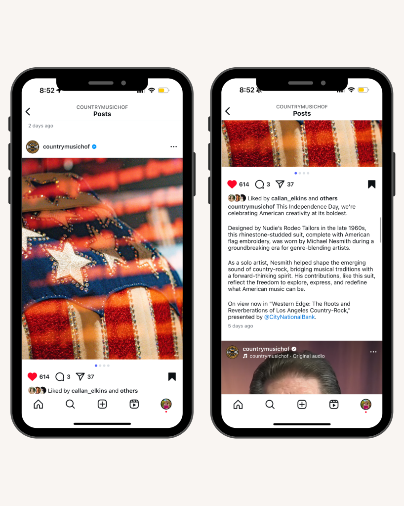 When planning content for the Fourth of July, the team initially landed on sharing a vintage Hatch Show Print design. After the meeting, another intern and I saw an opportunity to dig deeper by highlighting how the Museum reflects the evolving story of country music within American history. We researched artifacts with cultural significance and proposed featuring a Nudie suit from the collection, pairing it with thoughtful copy that explored its historical context. We collaborated with the creative intern to capture original photos, and I wrote the social copy to give the post a more meaningful narrative. When we presented the concept to our directors, they loved it.